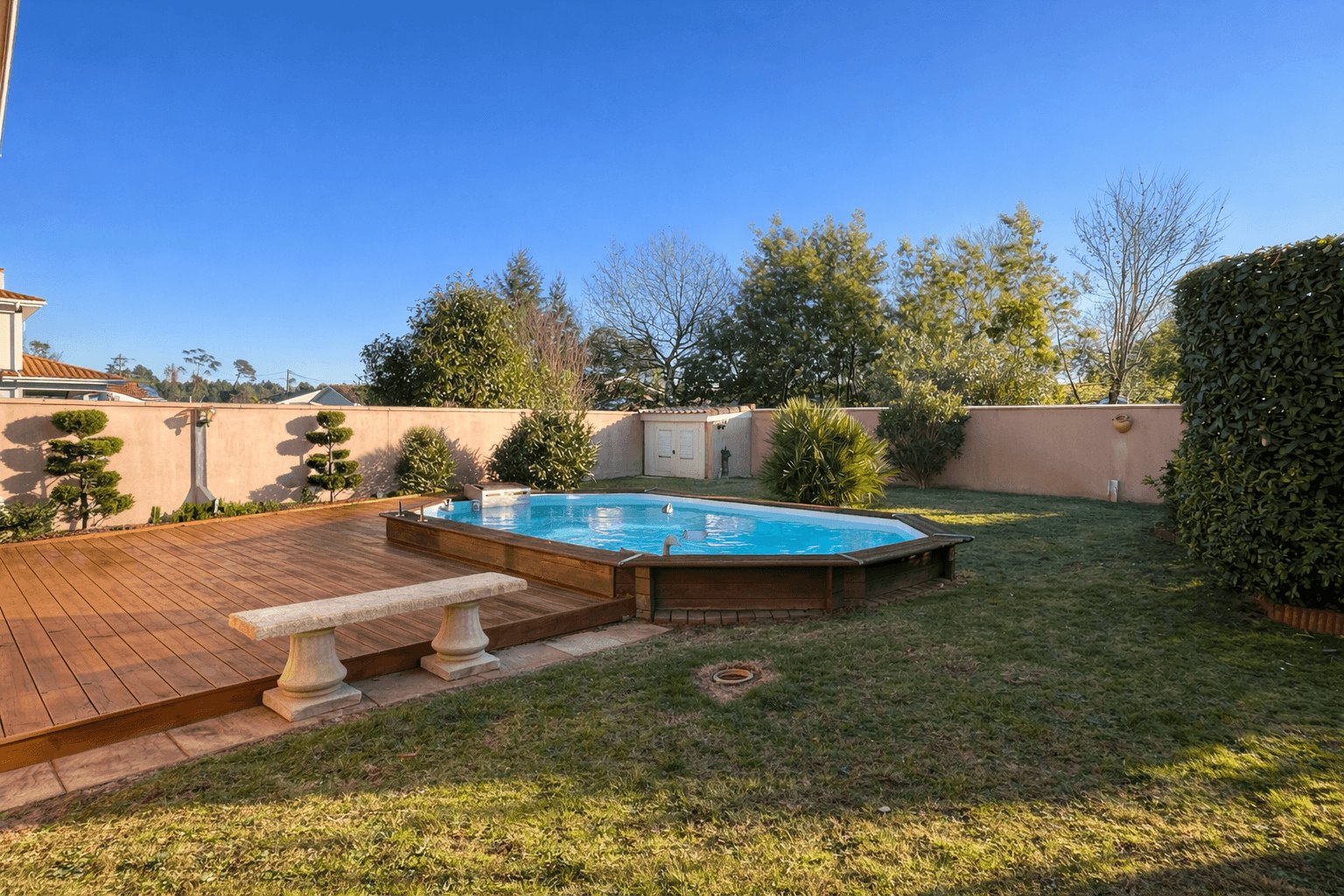 Un jardin paysager sans vis-à-vis, parfaitement entretenu, avec piscine.